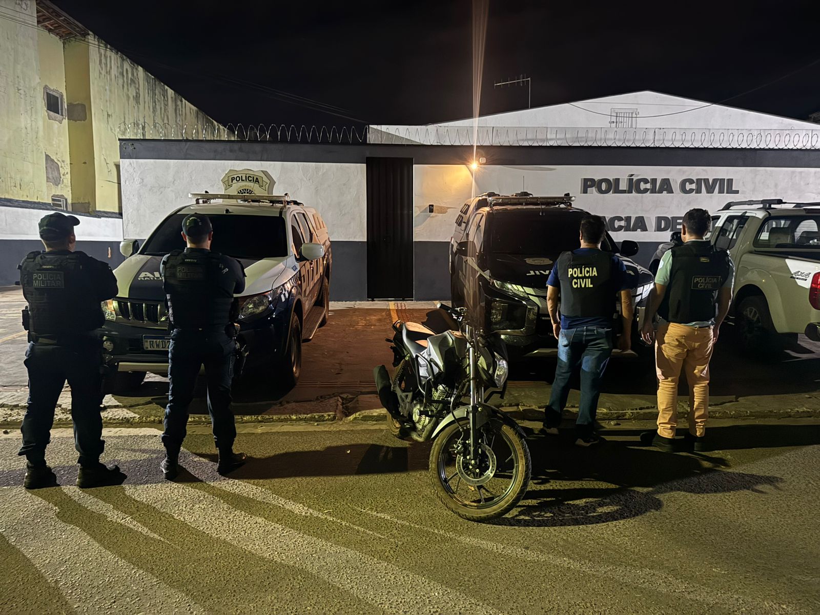 A motocicleta foi localizada pela Polícia Militar, escondida em área rural, enquanto a Polícia Civil localizou o segundo autor, que também confessou o roubo e informou o local onde havia descartado o simulacro de arma de fogo usado na ação.