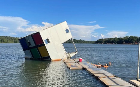 À primeira vista, o local parece uma miragem! Já se imaginou morando numa casa flutuante, mas que, à primeira vista, parece até que afundou? Esse lugar existe, está ancorado nas águas tranquilas do Lago Acaray, no Paraguai, e disponível para locação!