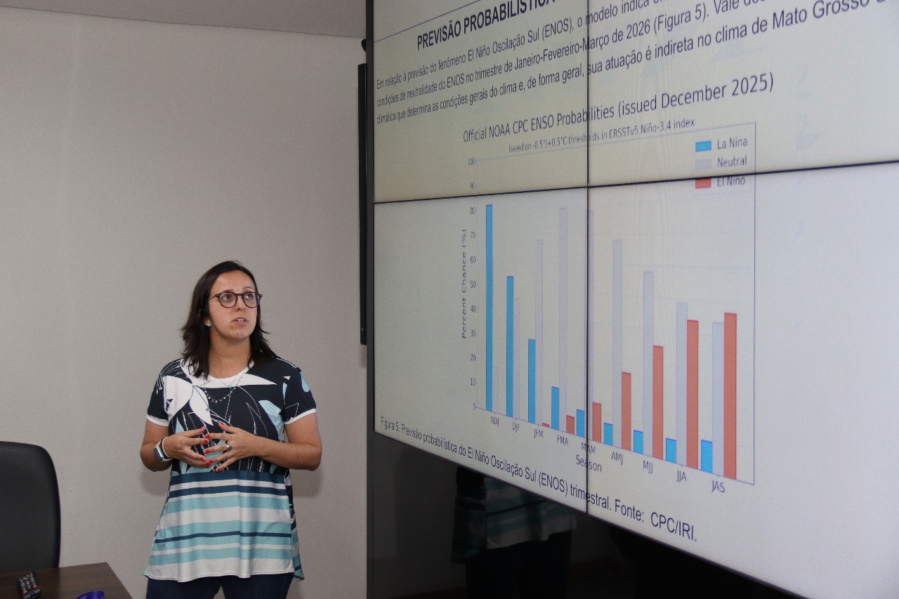 O Cemtec também apresentou as tendências climáticas para o primeiro trimestre de 2026, indicando um cenário que exige atenção e planejamento contínuo. A previsão probabilística aponta chuvas irregulares entre janeiro, fevereiro e março, com volumes que podem ficar ligeiramente abaixo ou acima da média histórica, a depender da região do Estado. As temperaturas devem permanecer próximas ou ligeiramente acima da média, caracterizando um trimestre mais quente que o normal. Em relação ao fenômeno El Niño–Oscilação Sul (ENOS), os modelos indicam cerca de 68% de probabilidade de neutralidade no trimestre, o que reforça a necessidade de manter o monitoramento constante e as ações preventivas integradas para minimizar riscos de novos incêndios florestais.