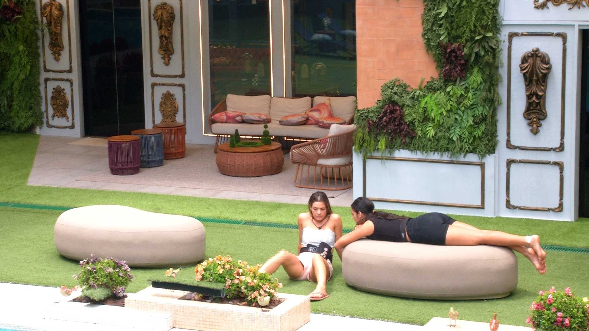 Beatriz conversa com Alane na área externa do BBB 24. A vendedora especula que Yasmin vai citar a “punição gravíssima” recebida por Alane no Sincerão desta segunda (11) e aconselha a bailarina.