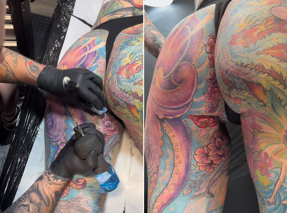“Dia incrível de tatuar o interior da minha bunda”, postou ela no Instagram na semana passada. Ela tem o objetivo de estar 100% tatuada.