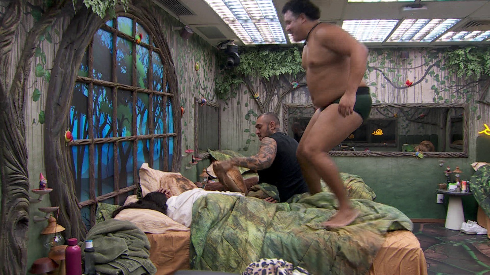 Lucas Henrique também chega no quarto e o artista fala: “Eu não vou sair daqui enquanto você não levantar. Nós vamos ficar enchendo o saco. Vamos?” “A vontade de vocês de encher o saco é menor que a minha de dormir”, rebate a sister, que finge estar dormindo e imita um ronco.