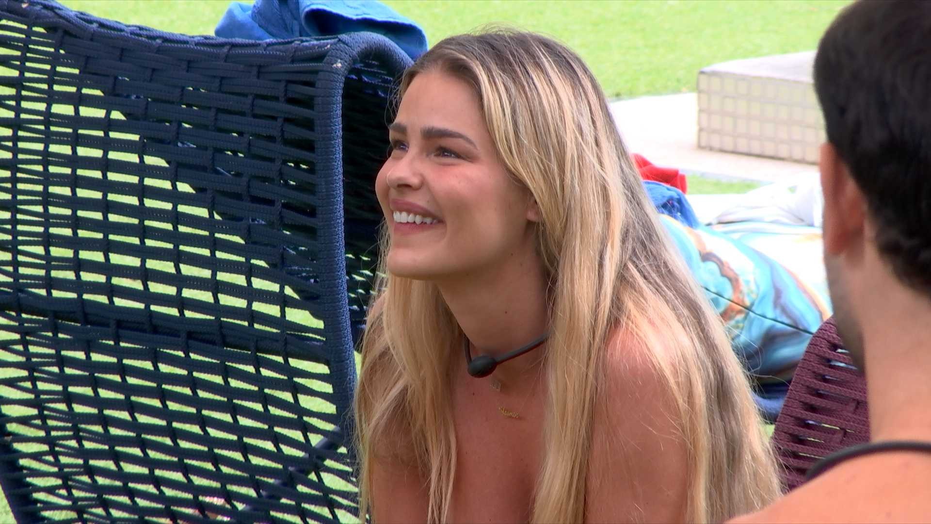 “Tô de roupinha de malhar, tenho quadril largo, tenho gordura aqui, celulite…”, diz Giovanna para Yasmin, que assiste ao desfile dos brothers sentada na área externa.