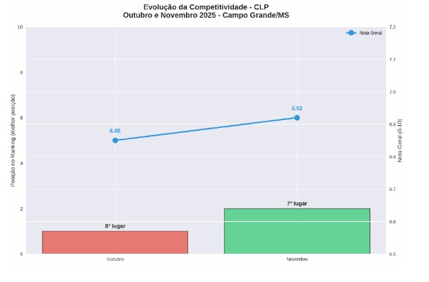 Os indicadores positivos impulsionaram a capital à 7ª posição no Ranking de Competitividade do Centro de Liderança Pública (CLP), uma evolução de uma colocação em relação ao mês anterior. No eixo de sustentabilidade, Campo Grande figura entre as seis melhores cidades do país, resultado de ações voltadas à inovação, investimentos públicos consistentes e ao fortalecimento dos setores produtivos.
