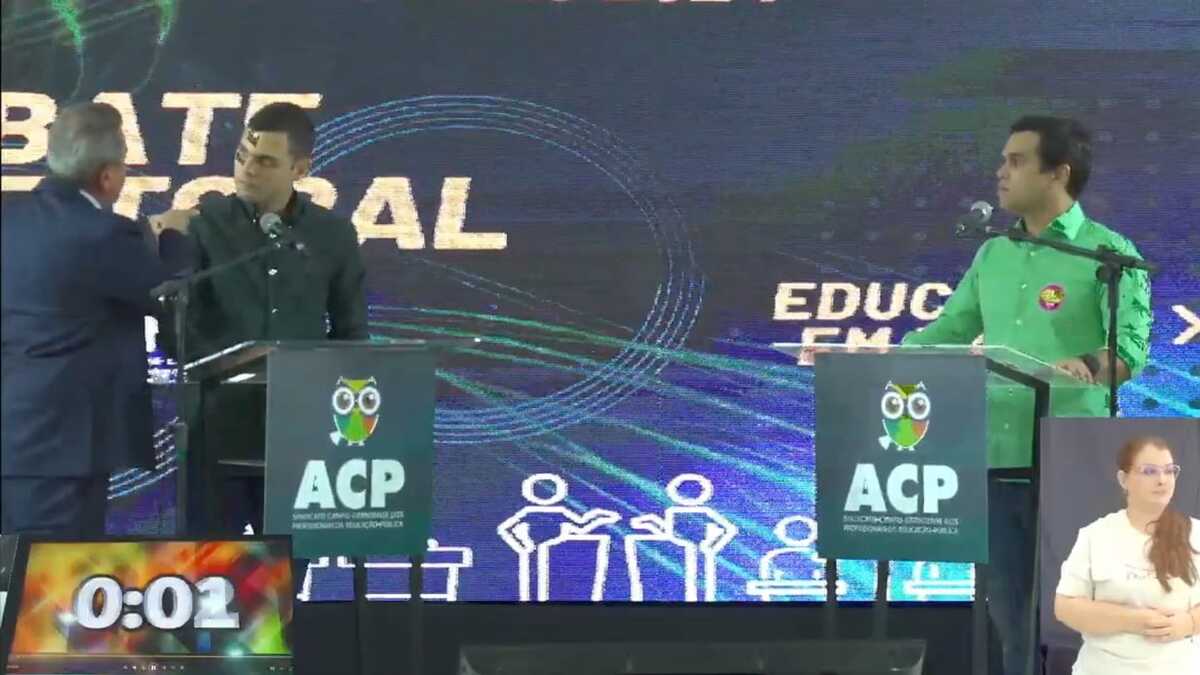 No entanto, logo após, durante embate entre Luso Queiroz (Psol) e Camila Jara (PT), o candidato se exaltou ao ser chamado de “louco” por Luso. Ele chegou a subir ao palco e apontou o dedo na cara do candidato adversário.
