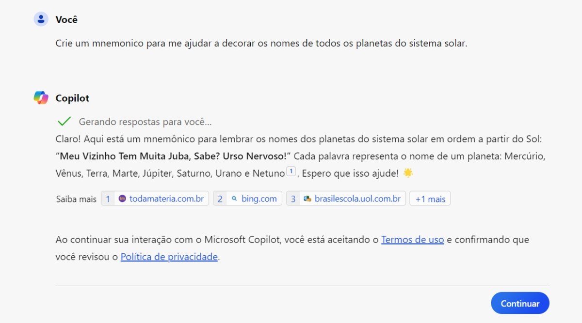 Estudantes podem recorrer ao Copilot para obter dicas e padrões simples que ajudem a decorar informações. O usuário pode solicitar a criação de mnemônicos, ou seja, proponha uma palavra, frase, rima, sigla ou imagem que possa ser associado às informações que devem ser memorizadas. A plataforma também pode ajudar a criar associações visuais, sugerindo imagens que liguem conceitos complexos a figuras fáceis de lembrar. O Copilot ainda pode sugerir histórias ou narrativas que incorporem os elementos que precisam ser memorizados, tornando a informação mais fácil de recordar. Basta indicar o formato desejado e o conteúdo que deve ser estudado para a ferramenta propor estratégias de memorização.
