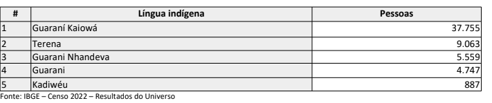 Entre indígenas com 2 anos ou mais, poderiam ser informadas até três línguas faladas ou utilizadas no domicílio. O Censo Demográfico identificou 48 línguas indígenas, contra 37 em 2010. Nas TIs, 20 línguas foram declaradas em 2022. As mais faladas são: Guarani-Kaiowá (37.755), Terena (9.063) e Guarani-Nhandeva (5.559).