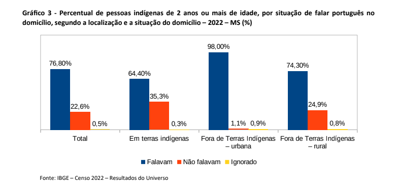 Mais de 75% dos indígenas de MS utilizam o português em casa. Em 2022, 85.922 pessoas (76,8%) falavam português no domicílio: 42.203 em TIs (64,4%) e 43.719 fora delas, sendo 38.510 em áreas urbanas e 5.209 em áreas rurais. Entre os que vivem fora das TIs, 98% em áreas urbanas e 74,3% em áreas rurais falam português.