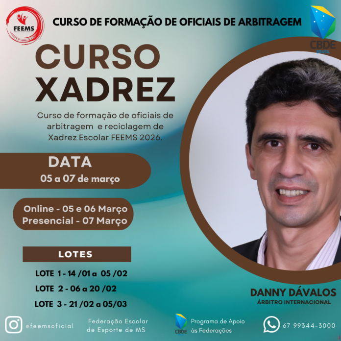 A Federação Escolar de Esportes de Mato Grosso do Sul (FEEMS) anuncia a abertura das inscrições para o Curso de Formação de Oficiais de Arbitragem Escolar na modalidade Xadrez, que será realizado no período de 05 a 07 de março de 2026.