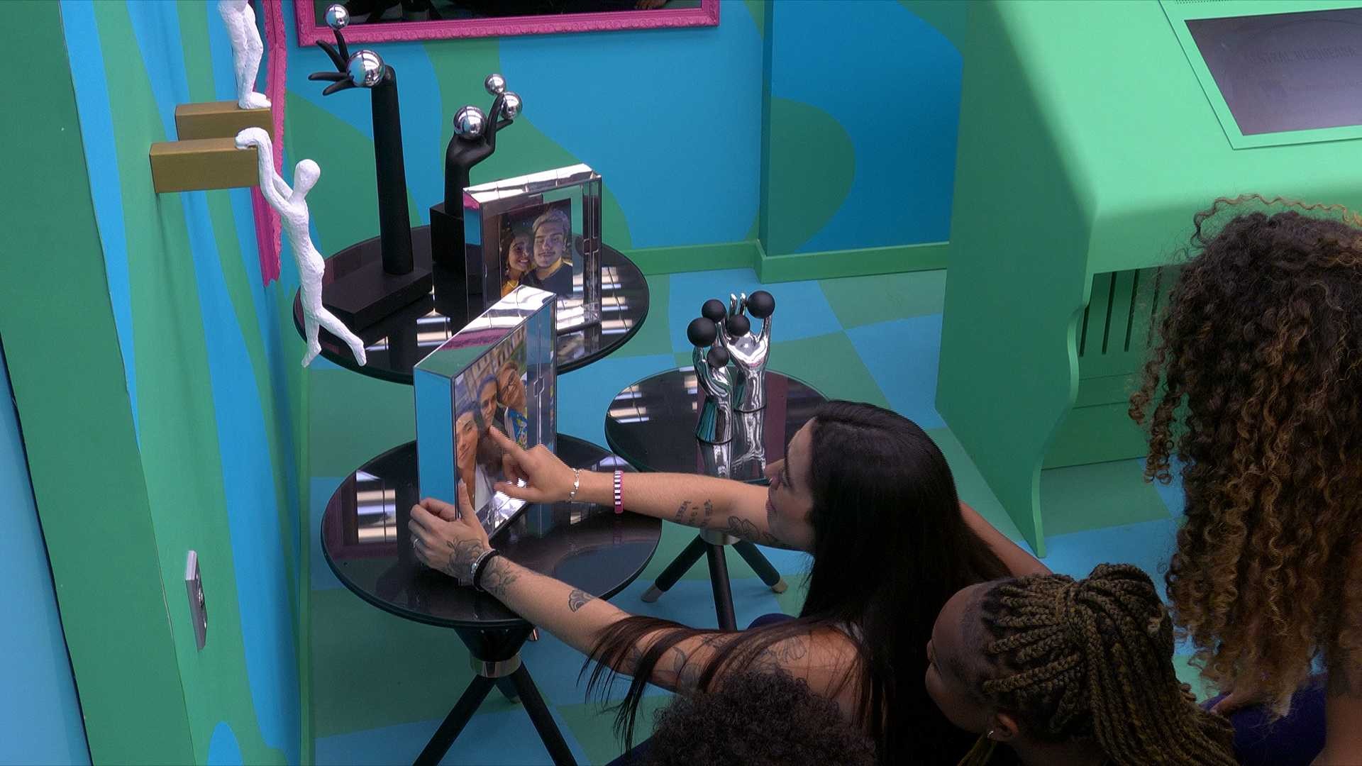 A sister entra no cômodo com Lucas Henrique, Pitel e Raquele. A mineira mostra a sua família nos porta-retratos para os brothers de seu VIP.
