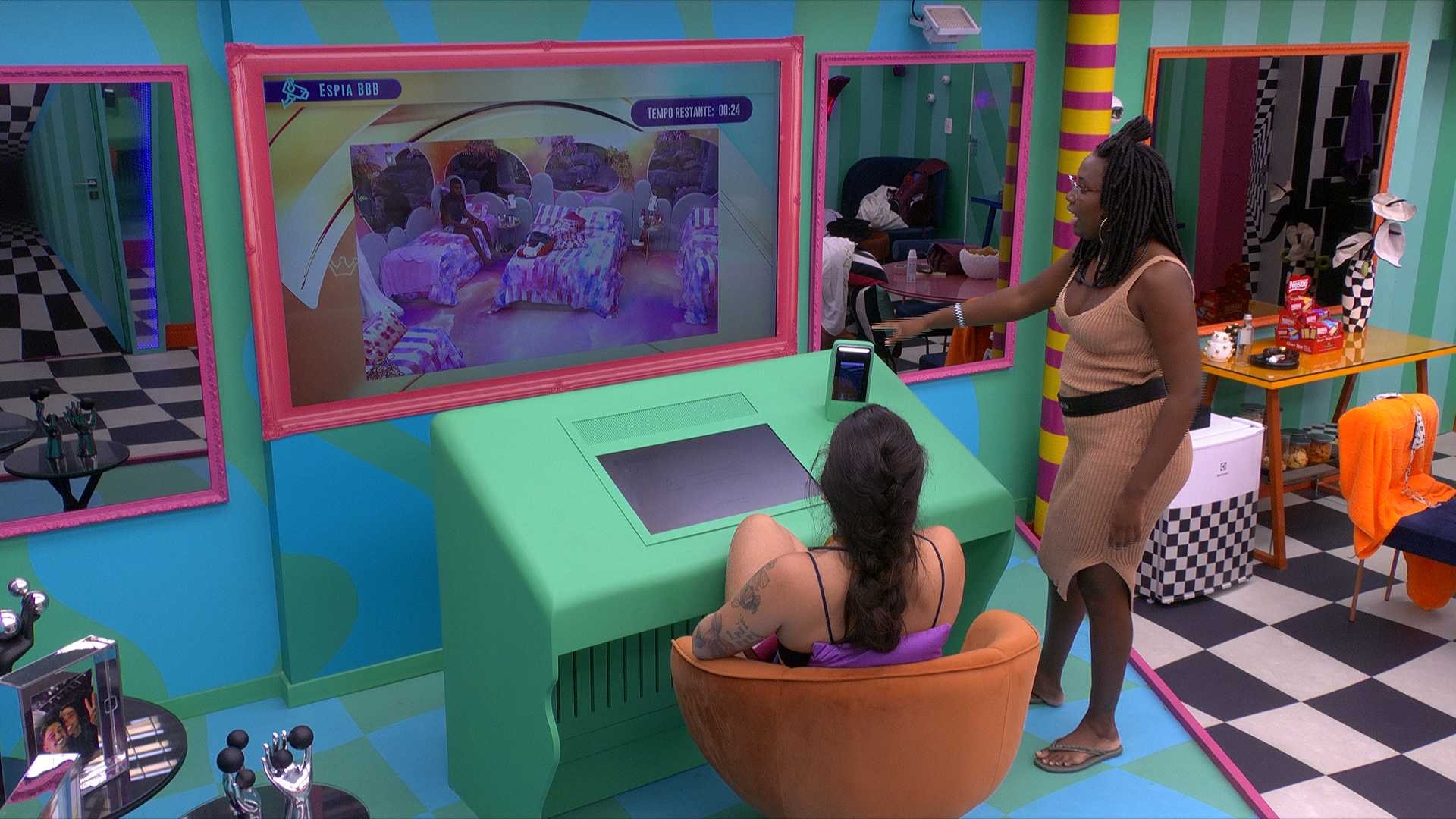 Elas sobem a escada, e Giovanna ativa o Espia BBB. Então, a dupla ouve um papo em que o baiano diz o que fará no Sincerão na noite desta segunda-feira.