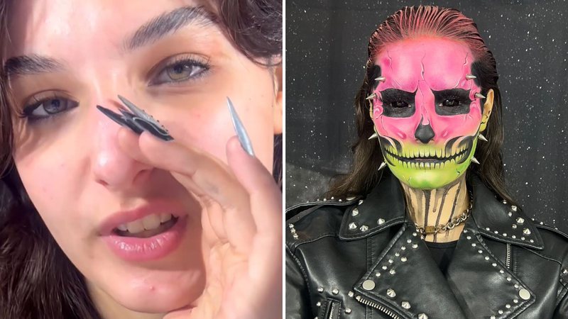 E você acha que foi fácil? Claro que não! A jovem de 21 anos ficou mais de horas sentada na cadeira se maquiando. “Demorei três horas para fazer, foi até que rápido. Eu já cheguei a demorar mais de 12 horas em maquiagem”, brincou. “Eu tô muito acostumada a fazer caveira, sempre foi a coisa que eu mais gostei no Halloween. Acabou sendo mais rápido por conta da minha facilidade”.