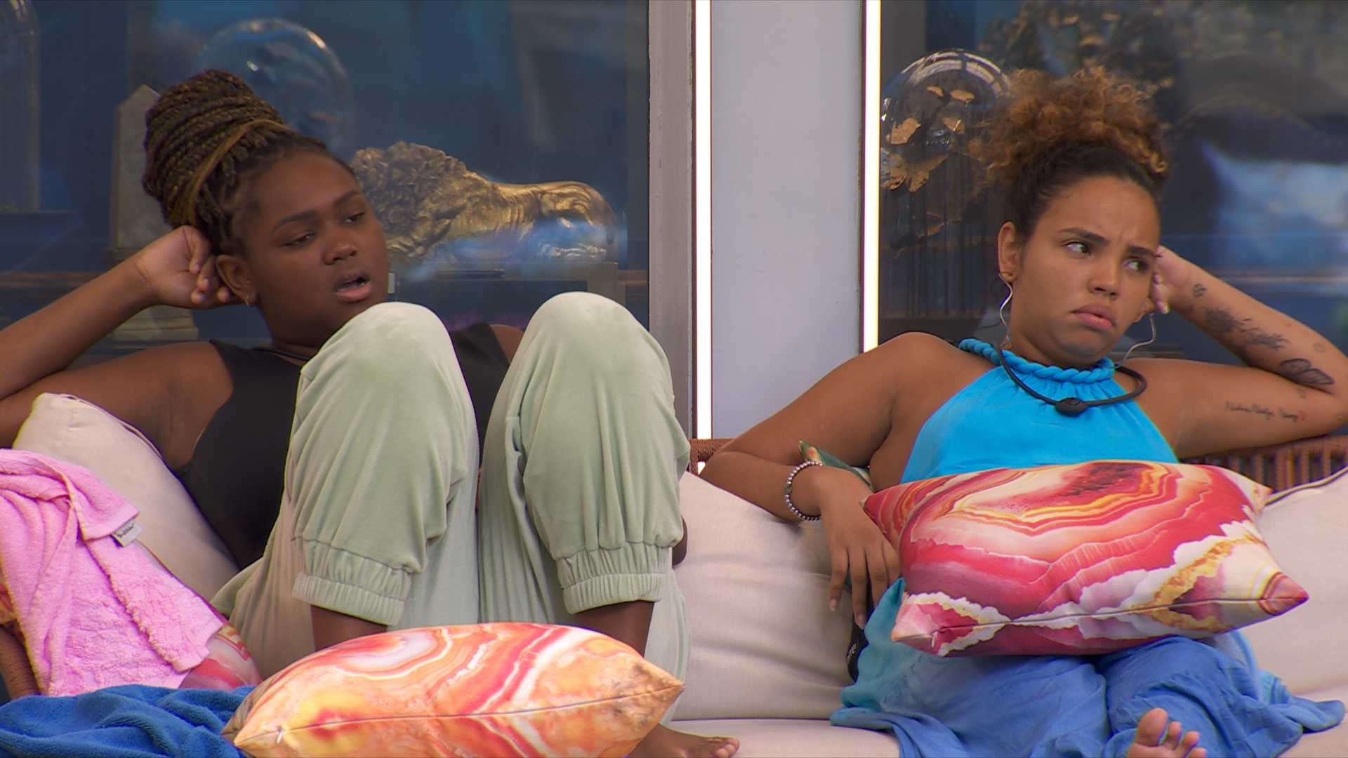 “Ou a Giovanna”, especula a trancista. “Não, ela vem em mim direto”, repete a alagoana. “Você ou a Giovanna, ela tem um ranço da Giovanna. Você ou Giovanna, das duas, uma”, comenta a trancista. A nutricionista, que também está na conversa, reage e bate na perna.