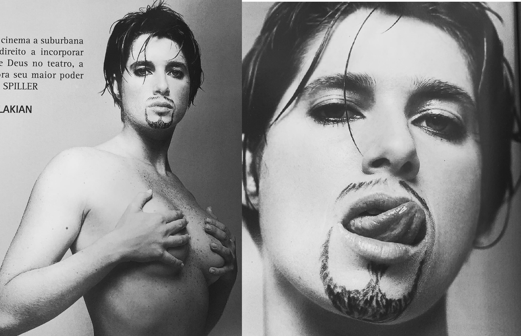 Nas fotos, ela aparece de cavanhaque e sem camisa, segurando os seios. Uau!