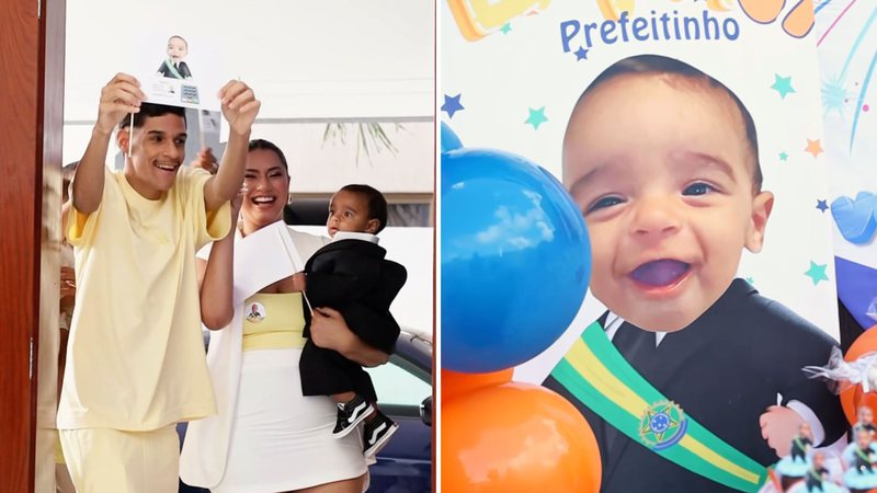 Os influenciadores Luva de Pedreiro e Távila Gomes comemoram os 7 meses do filho, Davi, com uma festa criativa no clima das Eleições 2024; veja
