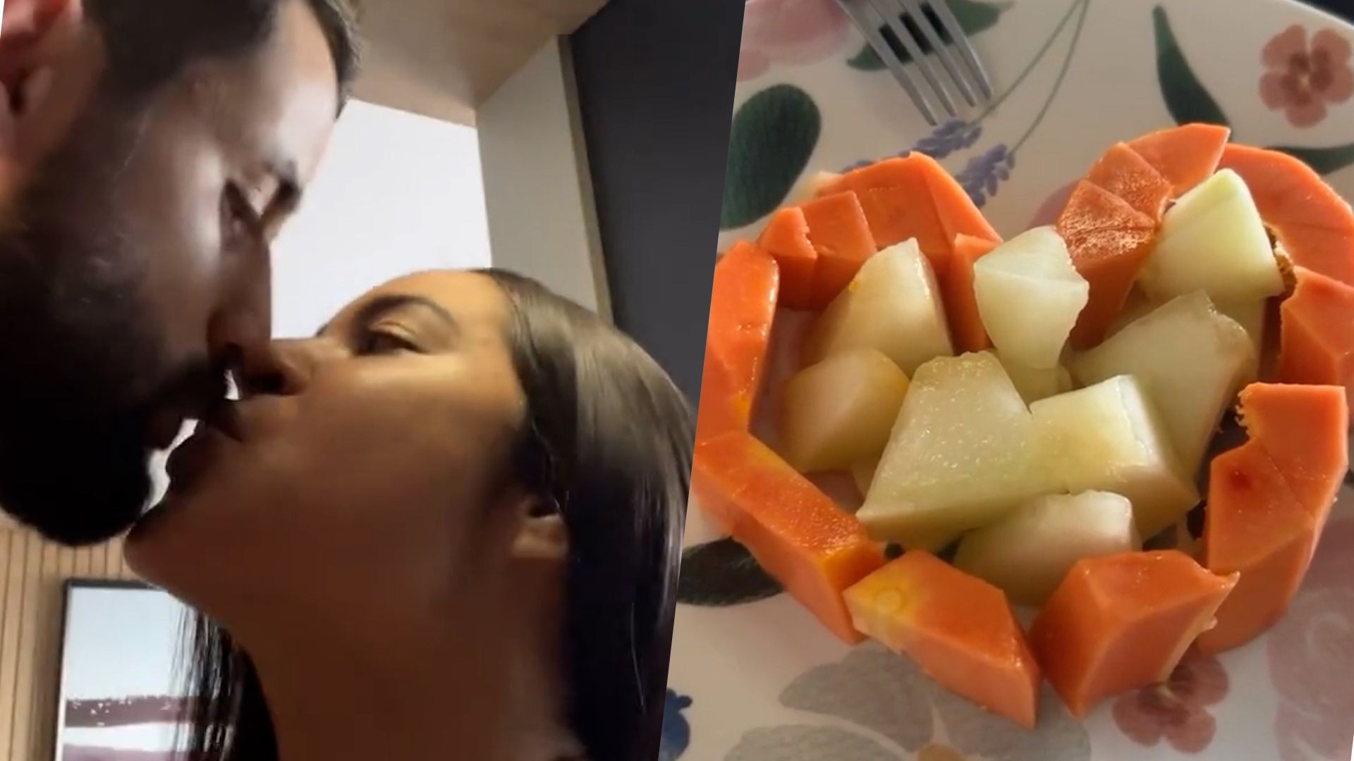 Em outro momento, a cunhã-poranga mostrou como o estudante de Engenharia Agrícola arrumou as frutas da refeição: em cubinhos, ele dispôs os pedaços no prato, formando um coração. É ou não é um casalzão?