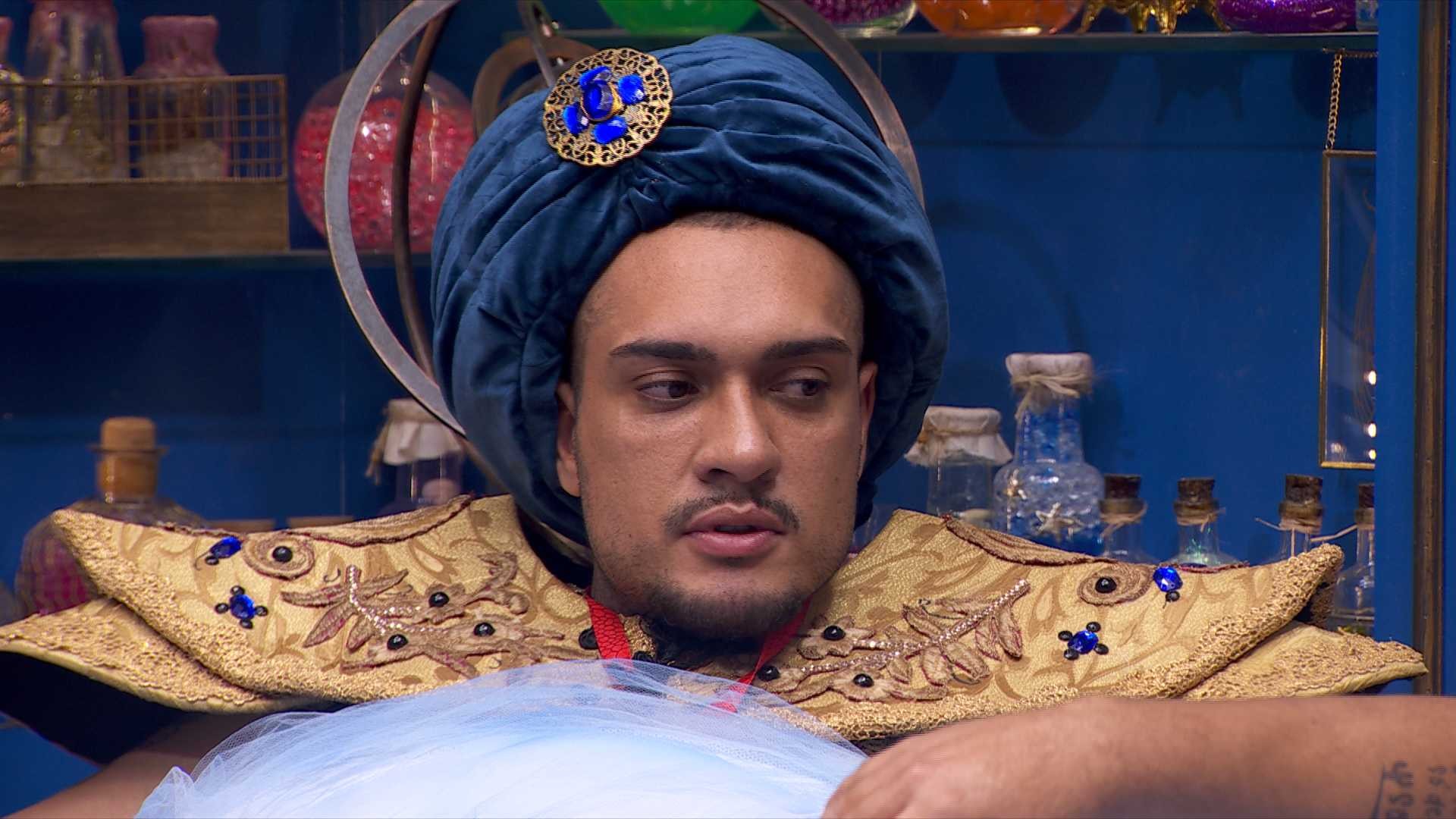 Brother conta sobre fim da relação para Lucas Henrique MC Bin Laden conversa com Lucas Henrique na sala. O funkeiro conta que ele e Giovanna decidiram terminar a relação. O brother explica que as questões do jogo e a falta de perspectiva para o relacionamento motivaram o término.
