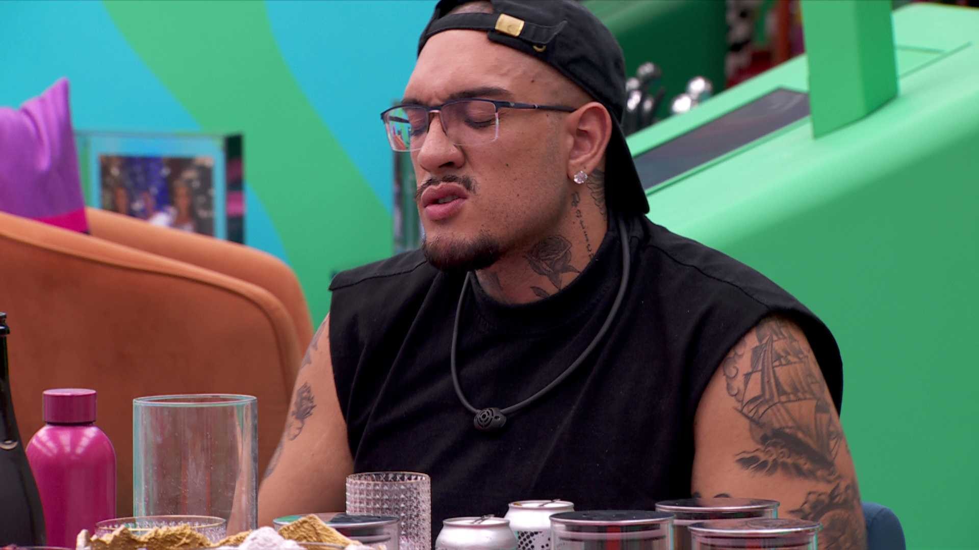 “Sabe uma pessoa que eu admiro lá fora? Uma pessoa que eu admiro, eu tive uma situação de caô; o Felipe Neto”, revela MC Bin Laden. “Vocês tiveram um caô?”, questiona Giovanna. Bin responde que sim com a cabeça. “Meu deus, ele teve caô com todo mundo”, declara a mineira.