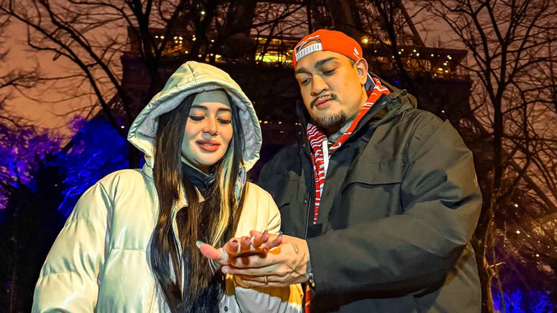 MC Binn, de 31 anos, surpreendeu a namorada, Ana Laura Marques, de 23, com um pedido de casamento aos pés da Torre Eiffel, em Paris, na França. O cantor está em turnê na Europa acompanhado da amada, a ocasião perfeita durante um dia de folga para o momento especial.
