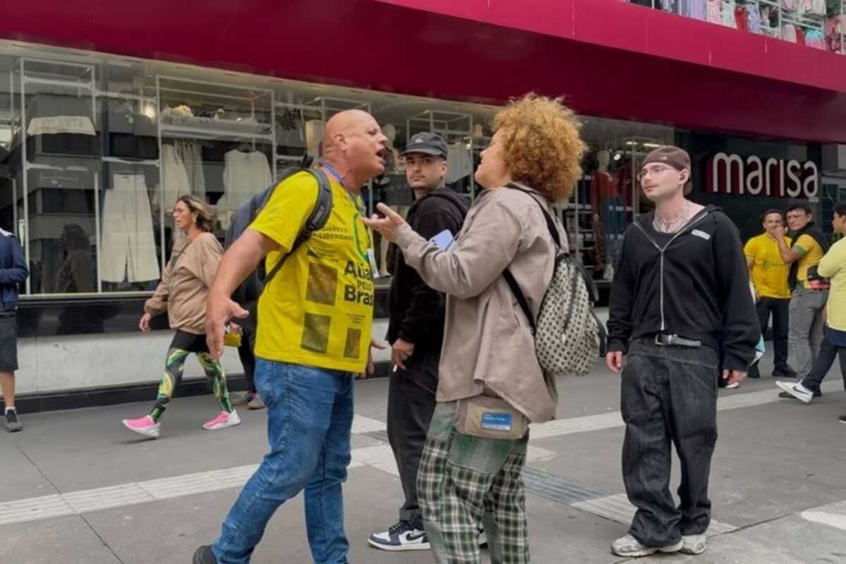 A confusão foi registrada pelo Metrópoles (veja vídeo abaixo). Nas imagens é possível ver que a mulher está na calçada, próximo ao local onde está o caminhão de som que deve receber Bolsonaro a partir das 14h, e começa a gritar em direção aos manifestantes bolsonaristas. Um deles, um homem que veste camisa amarela, reage, dando início a uma discussão tensa.