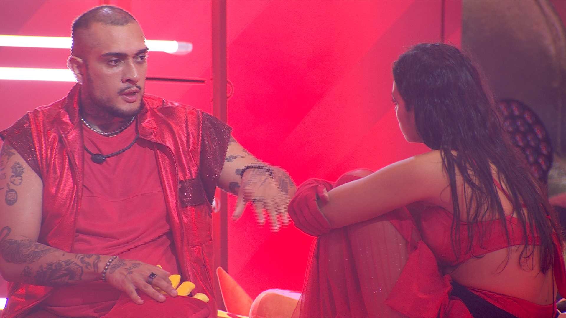 “A ideia é jogar, depois do jogo, lá fora…”, diz o músico, fazendo um sinal de positivo com a mão. “A minha razão funde muito com a minha emoção. Eu até sou mais emoção do que razão, e estou aprendendo a lidar com isso aqui. Por exemplo, eu queria ter conversado contigo, tentei conversar contigo duas vezes, aí você falou ‘não’. Falei ‘beleza, eu gosto dele, é uma pessoa que sim, votei, mas gosto dele’. Eu queria conversar porque eu sou essa pessoa emoção e respeito tu não querer”, responde a bailarina.