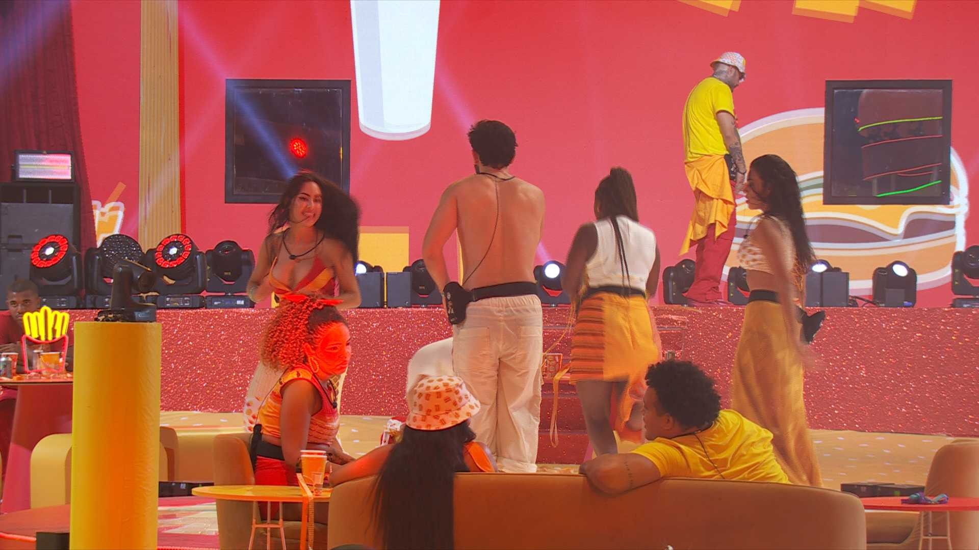Lucas Henrique comenta sobre uma sister do BBB 24 durante a Festa. O professor afirma que viu uma sister apontando para ele, ela tentou disfarçar e opina que poderia ser sobre o Poder Curinga. O papo acontece minutos depois de Alane, Davi e Matteus comentarem que um brother estava observando a conversa deles.