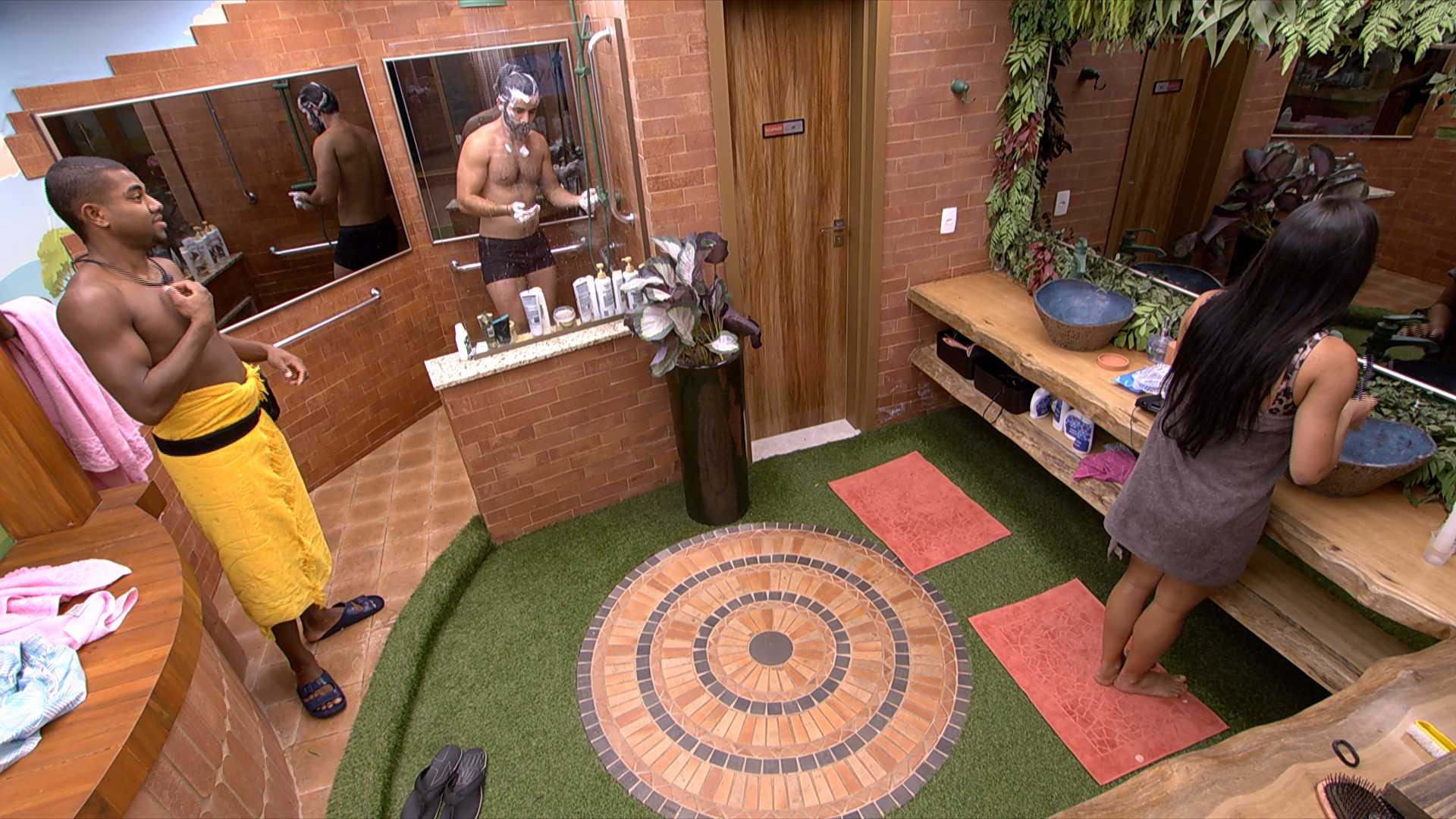 No banheiro, Davi, Isabelle e Matteus se preparam para a Final do BBB 24. O trio, que recebeu figurino exclusivo para usarem na ocasião, começa a tomar banho e se arrumar.