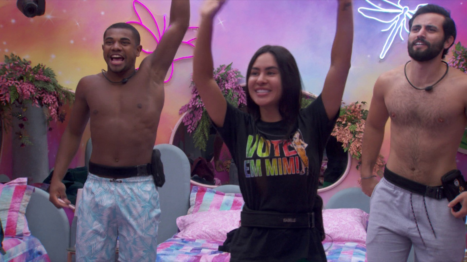 Eles pulam, comemorando, e quando a música acaba, os três unem as mãos e gritam juntos: “Finalistas”. Em seguida, os brothers se abraçam, se parabenizam e desejam boa sorte uns aos outros. “Chegamos”, diz Davi.