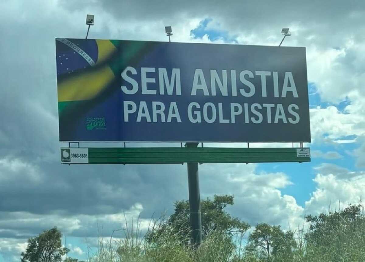 Uma placa instalada recentemente em frente ao condomínio Solar de Brasília, onde fica a casa de Jair Bolsonaro no Distrito Federal, cobra punição aos envolvidos nos atos do 8 de Janeiro. O outdoor com a frase “Sem anistia para golpistas” tem a bandeira do Brasil e é assinado pelo Comitê Popular de Luta do Jardim Botânico, bairro em área nobre da capital.