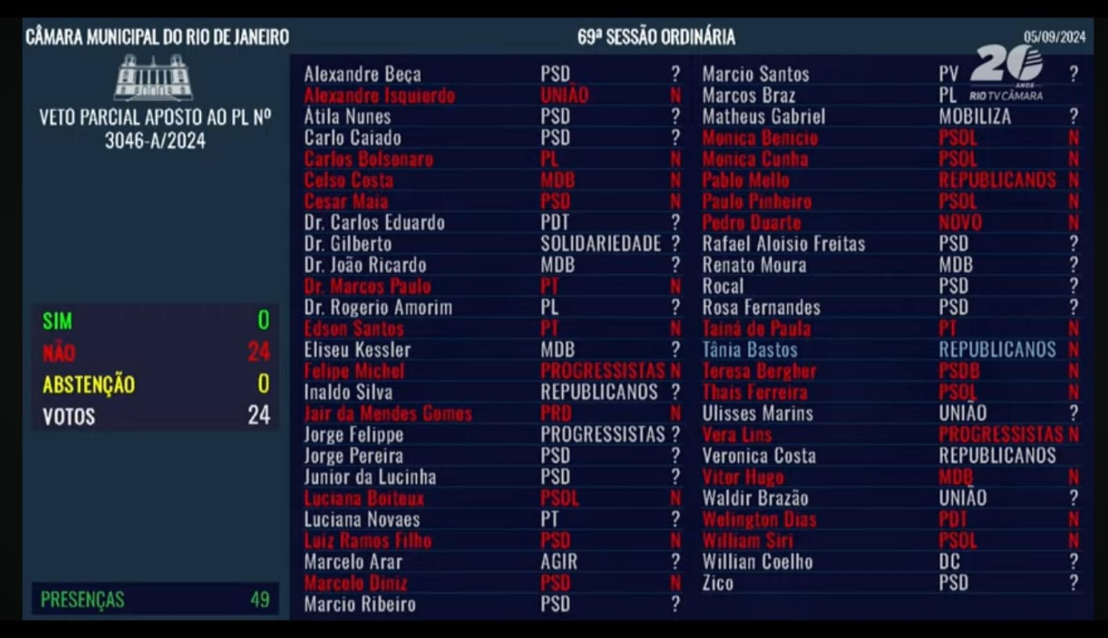 O prefeito do Rio de Janeiro, Eduardo Paes (PSD), justificou o veto, destacando que as diretrizes orçamentárias devem seguir os parâmetros estabelecidos pela Constituição Federal e pela Lei de Responsabilidade Fiscal (LRF). O prefeito alegou que a inclusão da emenda seria uma transgressão às normas de direito financeiro e violaria os princípios da separação entre os Poderes.