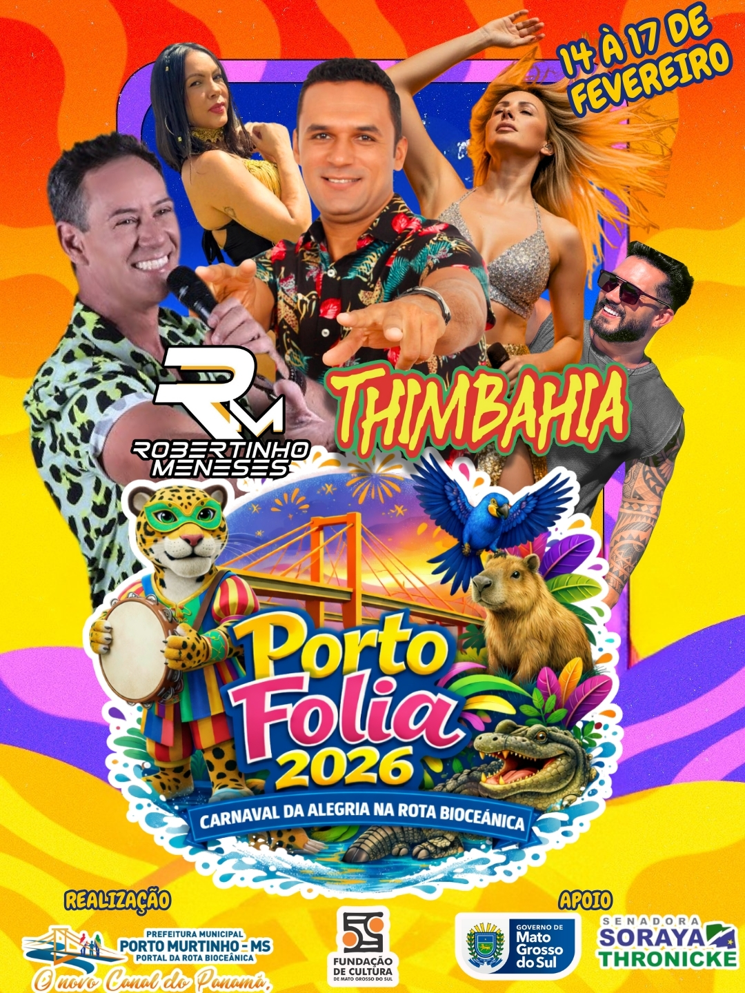 A Prefeitura Municipal de Porto Murtinho realizará, de 14 a 17 de fevereiro, o Porto Folia 2026 – Carnaval da Alegria na Rota Bioceânica. O evento acontecerá na Praça de Eventos José Barbosa de Souza Coelho e reunirá shows musicais, atrações locais e atividades para toda a família.