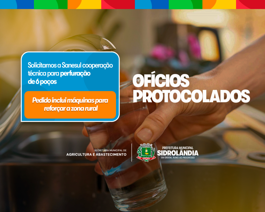 A Prefeitura de Sidrolândia, por meio da Secretaria Municipal de Agricultura e Abastecimento (Semaa), protocolou dois ofícios junto à Empresa de Saneamento de Mato Grosso do Sul (Sanesul), em Campo Grande, solicitando cooperação técnica para perfuração de poços artesianos e destinação de maquinários e equipamentos operacionais que estejam obsoletos para a companhia, visando reforçar a infraestrutura do município.