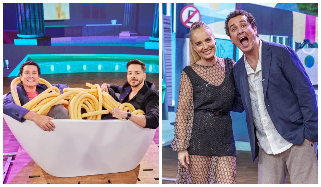 O cantor e a apresentadora voltaram no tempo com o anfitrião humorista: enquanto o irmão de Sandy recriou uma foto de revista teen dentro de uma banheira cheia de macarrão instantâneo, a loira falou sobre ser constantemente solicitada para cantar o hit “Vou de táxi”: