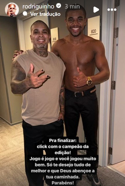 “Click com o campeão da edição! Jogo é jogo e você jogou muito bem. Só te desejo tudo de melhor e que Deus abençoe a tua caminhada. Parabéns”, escreve Rodriguinho.