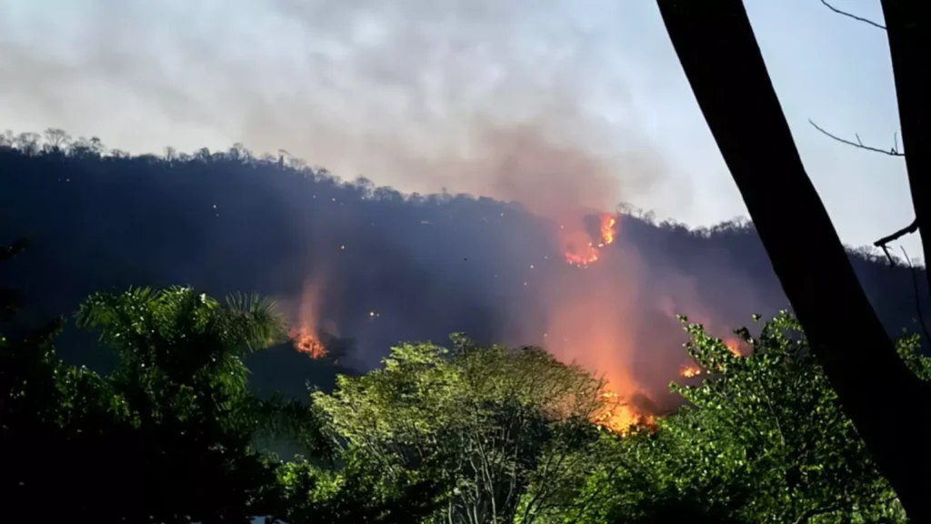 O combate ao incêndio que se alastra pela Serra da Bodoquena continua pelo quarto dia seguido. As chamas estão a apenas cerca de 2 quilômetros do Parque Nacional e já passaram pela pousada Refúgio Canaã e pela cachoeira Boca da Onça, a maior queda d’água do Estado.