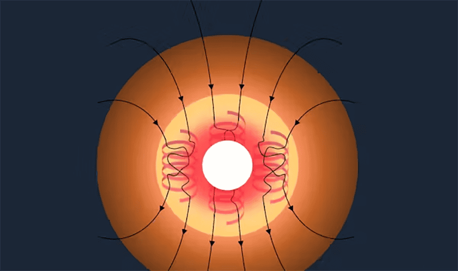 Durante a solidificação, elementos como oxigênio e carbono, que não se misturam bem com um sólido quente, são expulsos, criando um líquido quente e menos denso na base do núcleo externo. De acordo com o pesquisador, esse líquido ascende e se mistura com o restante do núcleo externo, gerando correntes elétricas que produzem o campo magnético da Terra.