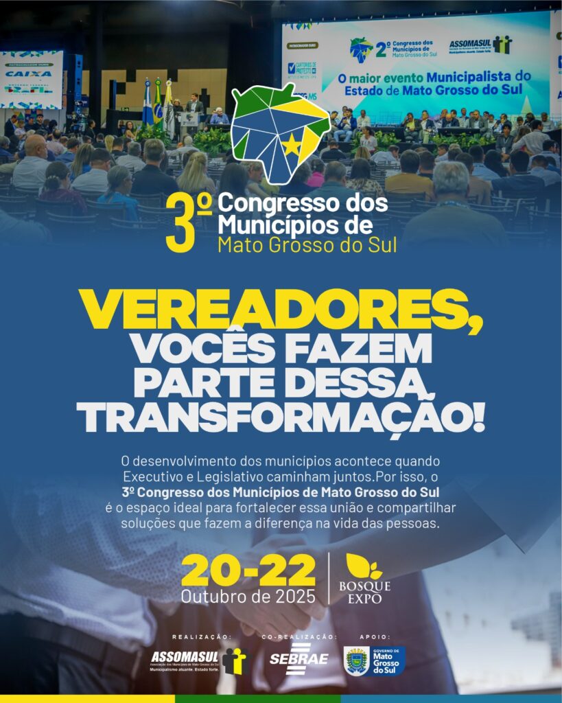 O 3º Congresso dos Municípios de Mato Grosso do Sul, que será realizado nos dias 20, 21 e 22 de outubro, no Bosque Expo, em Campo Grande, destaca o papel essencial dos vereadores e vereadoras na construção de políticas públicas eficientes e no fortalecimento do municipalismo.