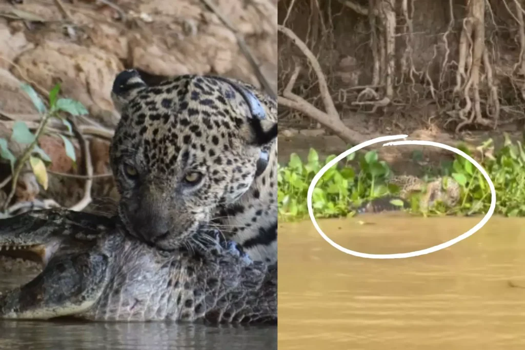 De boa na lagoa, ou melhor, no rio, o jacaré nem se deu conta de que estava sendo observado. Era por volta das 13h e a onça “Ousado” estava com fome. Sem pensar muito, pulou para garantir o almoço e o combate rolou na água por quase um minuto.
